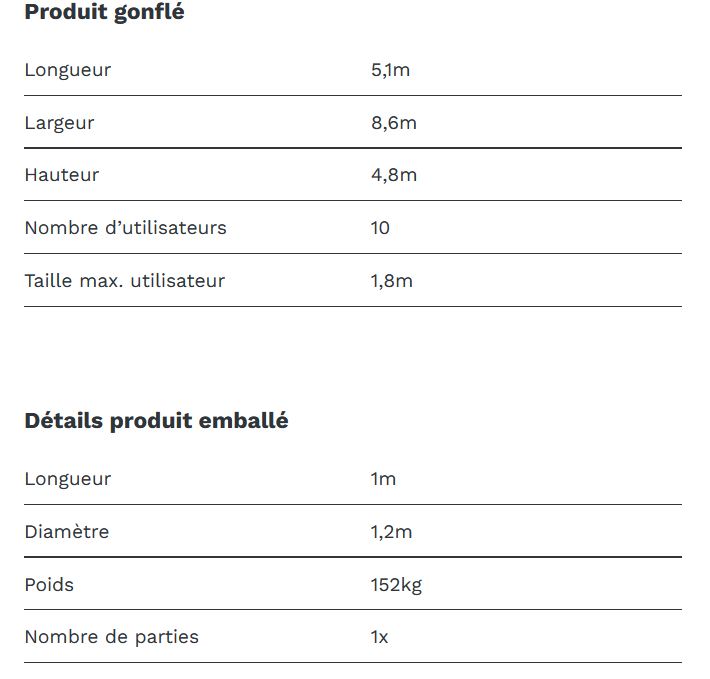 Dimensions: 5,1 m x 8,7 m x 4,7 m, capacité 10 personnes à partir de 4 ans (taille maximale utilisateur 1m80).
