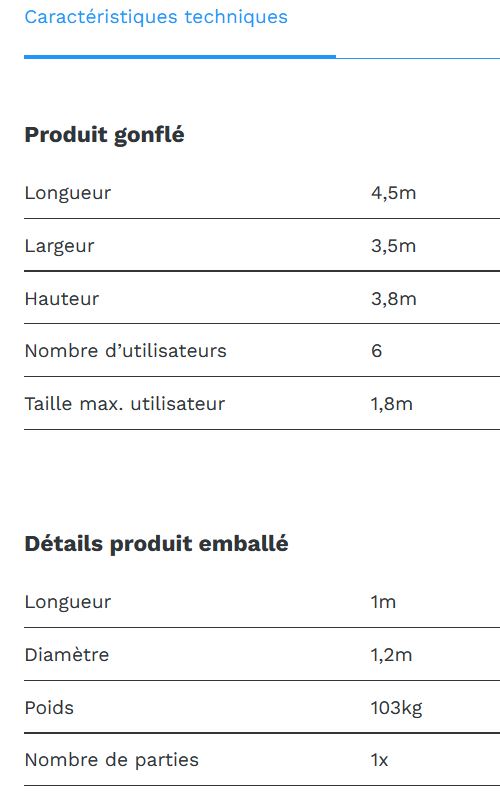 Dimensions: 3,5 m x 4,5 m x 3,3 m, capacité 6 personnes à partir de 4 ans (taille maximale utilisateur 1m80).